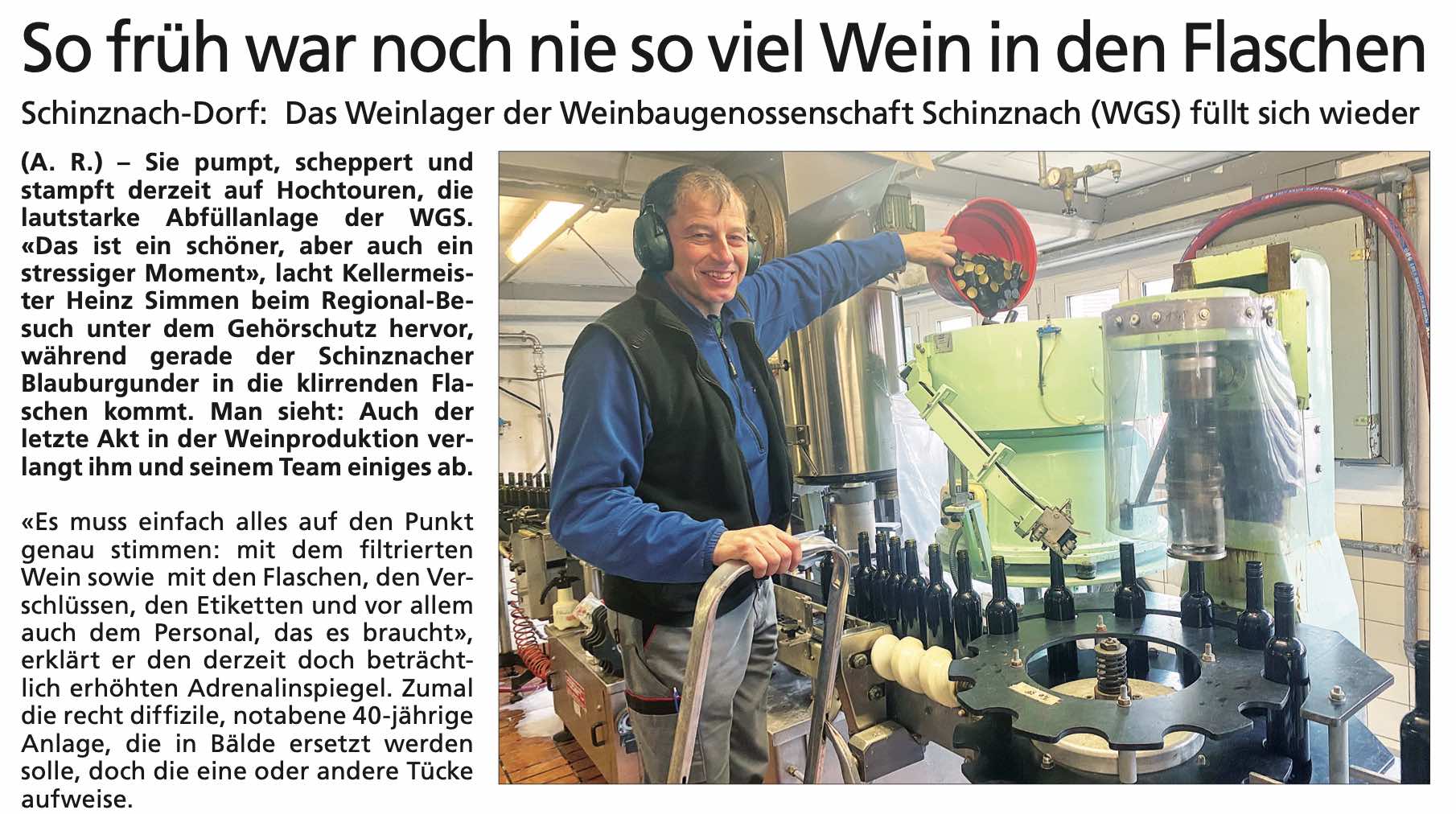 Veröffentlicht am 10. April 202316. April 2023 von weinkeller_admin So früh war noch nie so viel Wein in den Flaschen Das Weinlager der Weinbaugenossenschaft Schinznach (WGS) füllt sich wieder Artikel Regional-Brugg 04.04.2023 Beitrags-NavigationVorheriger Beitrag: 2022 Goldener Weingenuss Branchenverband AargauNächster Beitrag: 2023 Goldener Weingenuss Branchenverband Aargau